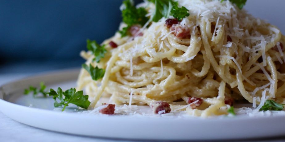 - Verter la pasta al sartén con el tocino, mezclar bien durante un minuto. Apagar y revolver con la mezcla de huevo.